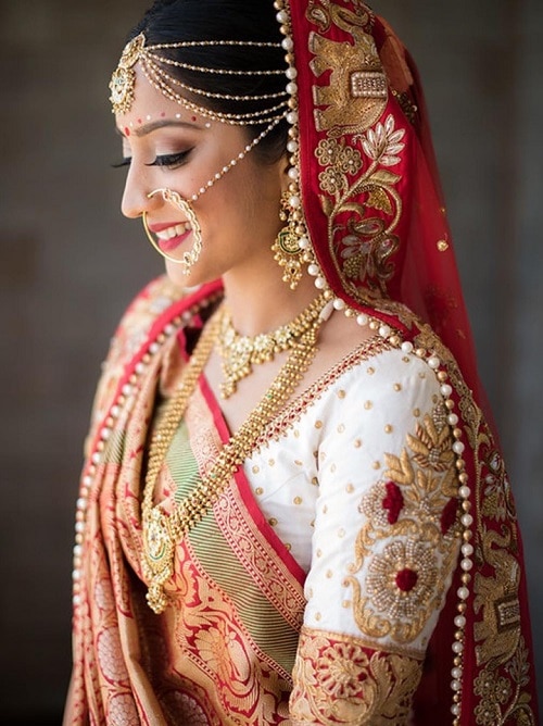 Bengali people follow the ritual and tradition wholeheartedly and it reflects in their wedding dress also. As a marriage Hindu couple wedding dress, they wear Banarasi having a crown on forehead and groom wear white dhoti. The style is the correct example for less is more.