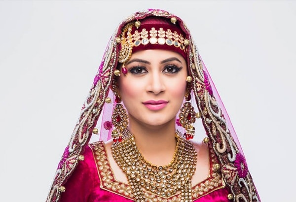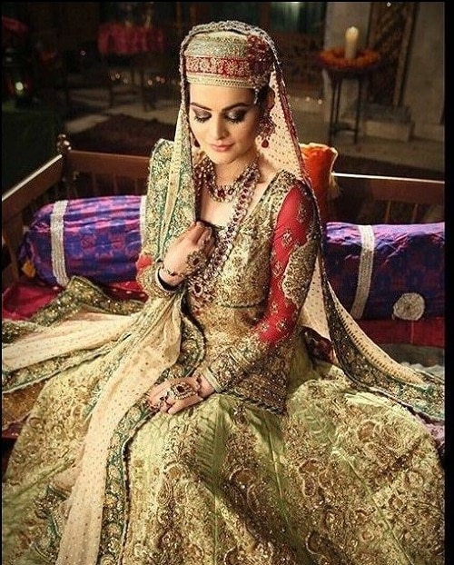 For brides, a kind pheran embroidered with golden work that includes Taranga, kalpush, matching dupatta, and heavy jewelry and bangles. An especial kind of necklace that the bride wear is’ Dejharoo’ known as mangalsutra.
