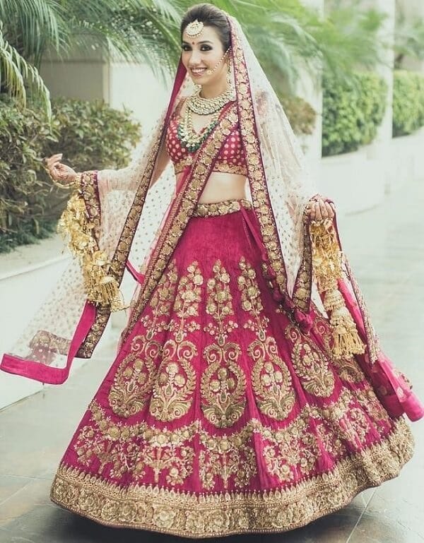 Punjabi people are mostly known for a lavish and grand style of wedding so as their wedding outfits. The couple ethnic wear for our Punjabi wedding is sherwani, turban, and Katar for the groom and lehenga with the perfect combination of red Chura for the bride. Most of the soon-to-be-married couples choose this wedding dress style for their wedding.